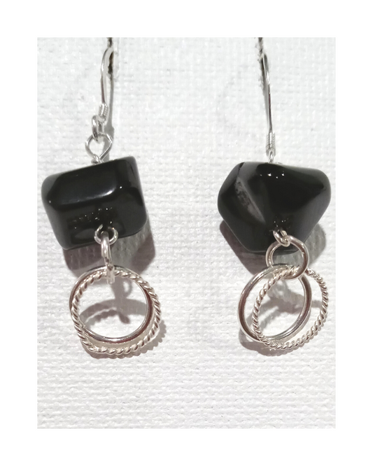 Black Agate Polished Bead with Double Silver Loop Sterling Silver Dangle Earrings