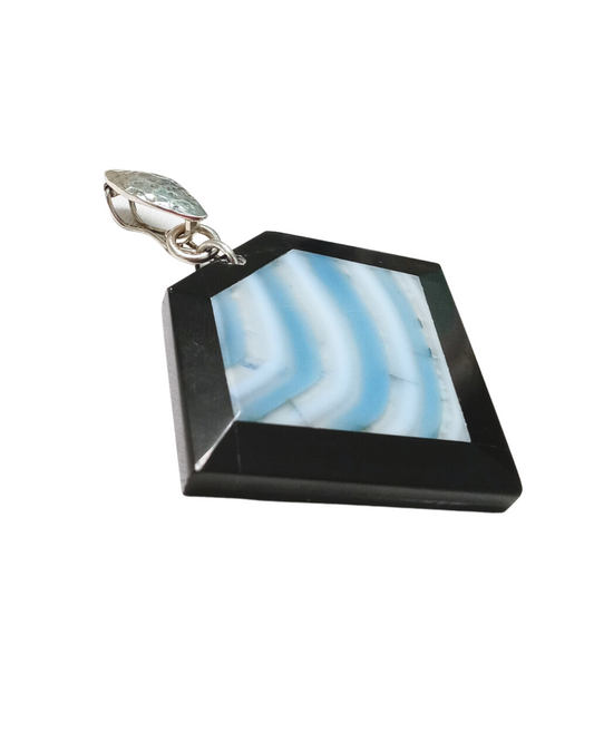 Beautiful Blue Stripe Agate and Black Onyx Intarsia Gemstone Sterling Enhancer Pendant with Removable Interchangeable Clip 2 7/16"L X 2"W ONE ONLY.