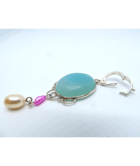 Dreamy Blue Oval Chalcedony with Pink, Peach Pearls Sterling Silver Enhancer Pendant Approx. 2 3/4"L X 3/4". ONE ONLY.