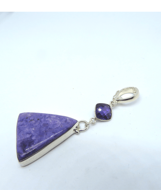 Rare Charoite Large Triangle-shaped, and Checkerboard Faceted Amethyst Sterling Silver Enhancer Pendant Approx. 2 1/4"L X 7/8"W. ONE ONLY.