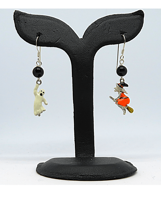 Halloween Witch and Ghost 3-D Hand-enameled with Black Onyx Sterling Silver Earrings