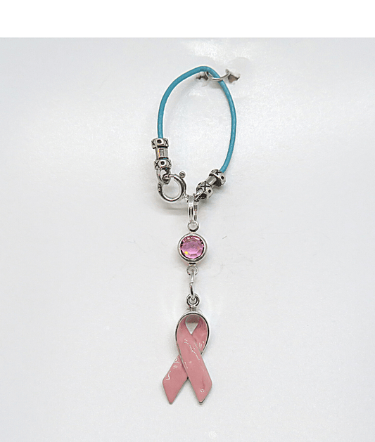 Pink Ribbon Sterling Hand-enameled with Pink Swarovski Crystal Removable Charm on Leather KooLoop approximately 2 7/8″, Removable Charm is 1 3/4″ L