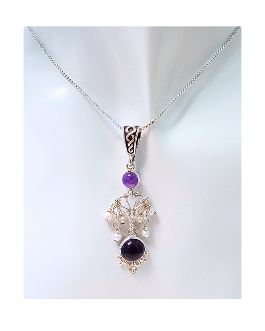 Exclusive Beautiful Amethyst Gems and Tiny White Pearl Drop Sterling Silver Removable Pendant 2 1/4"L X 5/8"W on 18" Curb Chain. ONE ONLY