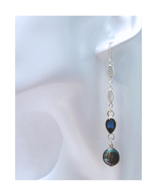 Exclusive Sterling Dangle Earrings with Labradorite, Agate and Coin Pearl Drops 3 5/16"L X 1/2"W. ONE ONLY.