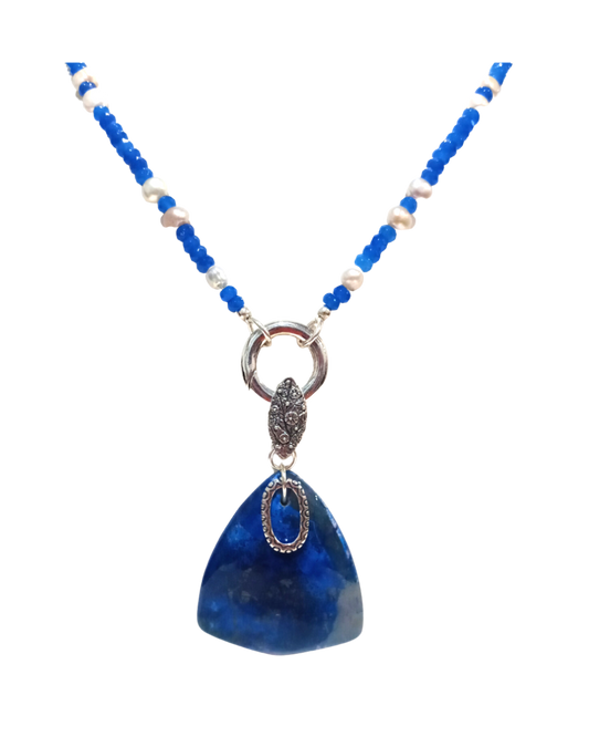 Interchangeable Blue Agate and Pearl Necklace with Removable Large Extraordinary Blue Agate Enhancer Pendant. ONE ONLY