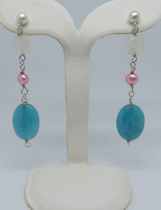 Rainbow Moonstone, Pink Pearl, Blue Faceted Jade Sterling Silver Posts ONE ONLY