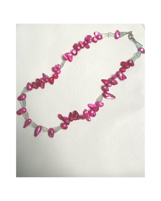 Fuschia Pink Dyed Baroque Pearl and Light Green Triangle Aventurine Sterling 19 1/2" Necklace ONE ONLY