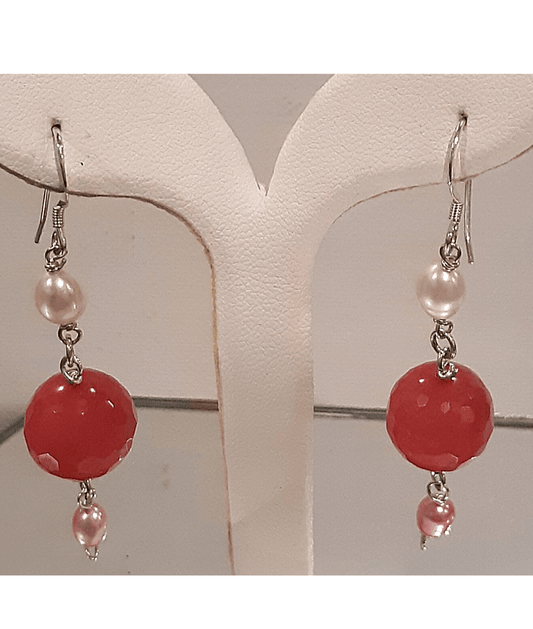 Cherry Quartz, Sand-color Pearls and Red/Orange Coral Sterling Silver Dangle Earrings 2 5/8" ONE ONLY