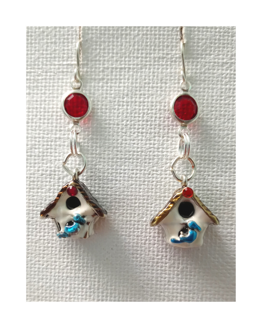 Exclusive Sterling 3-D 2-sided Hand-enameled Bluebird House with Red Swarovski Crystals Earrings 1 13/16"L X 5/8"W ONE ONLY