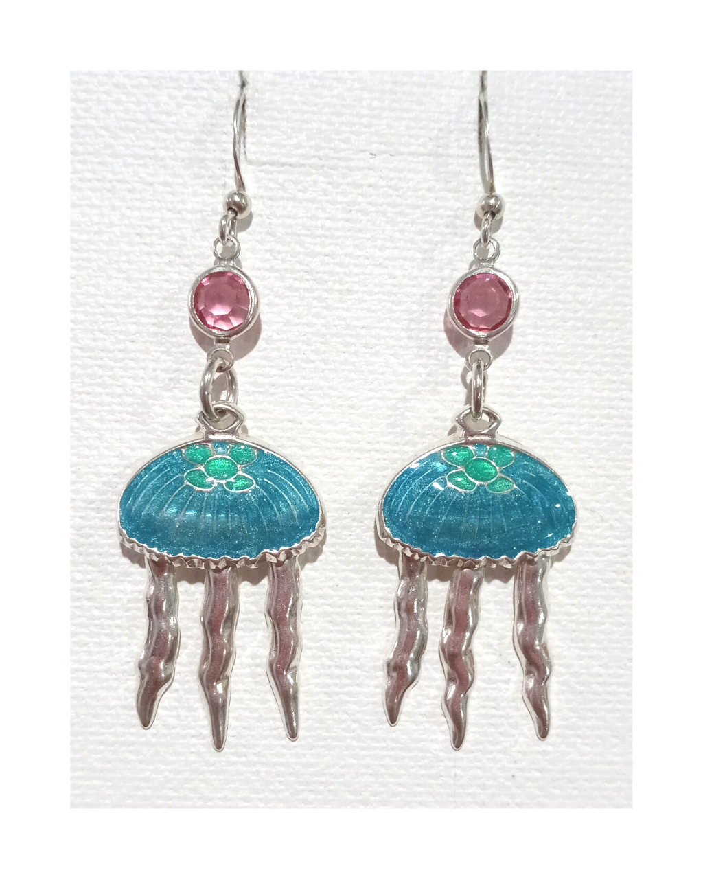Incredible exclusive hand-enameled sterling moveable dangly legs jellyfish with pink Swarovski crystal earrings. So pretty! 2 1/2"H X 3/4"W.