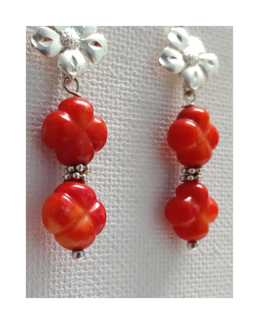 Exclusive Gorgeous Sterling Dogwood Flower Diamond-cut Post Earrings with Carved Red Coral Flowers 1 9/16"L X 7/16"W
