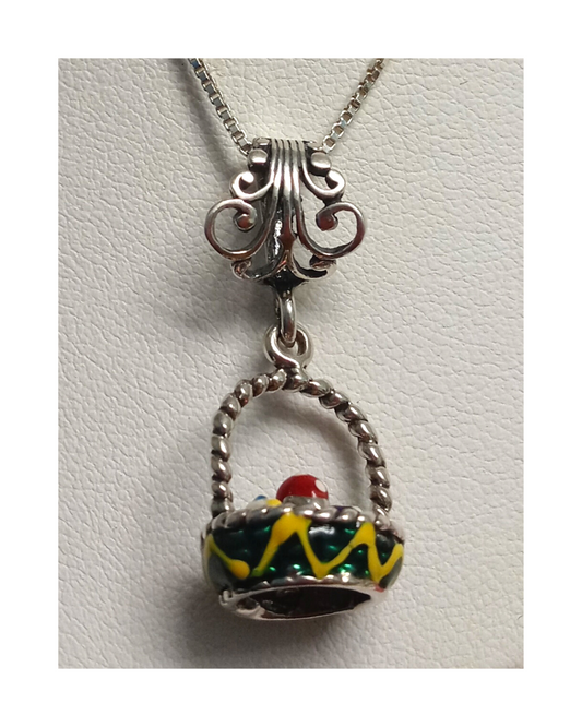 Exclusive Amazing Sterling Hand-enameled Wearable Art 3-D Easter Basket with Enamel Eggs Inside Basket Removable Pendant on 18" Box Chain