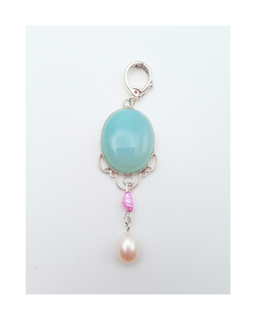 Beautiful sterling silver dreamy blue oval chalcedony with bright pink and light peach pearl enhancer pendant with clasp that opens up to clip onto pearls, chains, beads, or whatever you want. You will love the ethereal translucent blue chalcedony! .Approximately 2 3/4"L X 3/4". ONE ONLY.