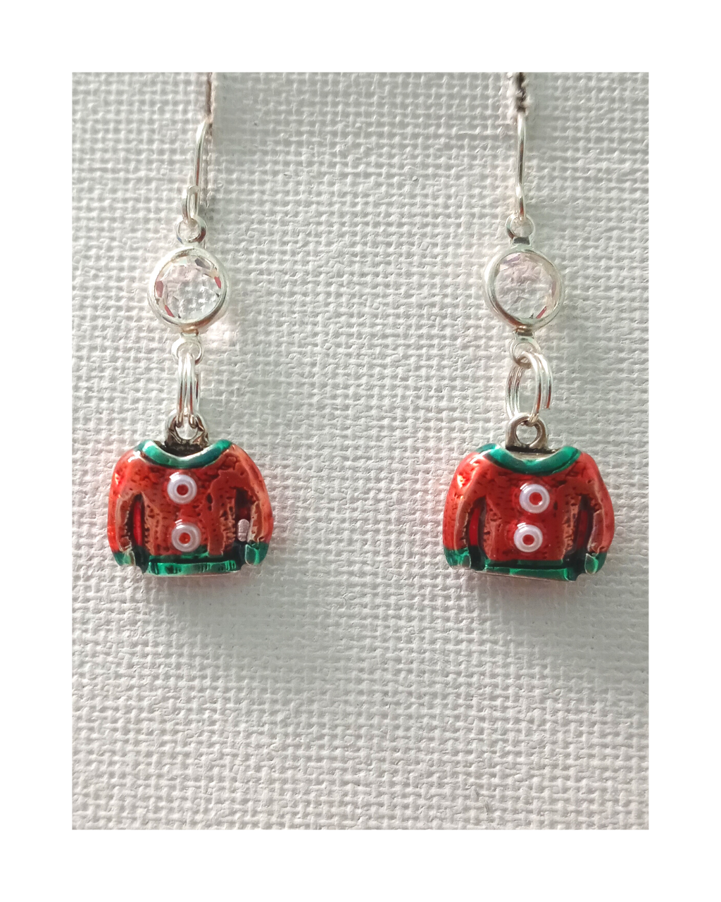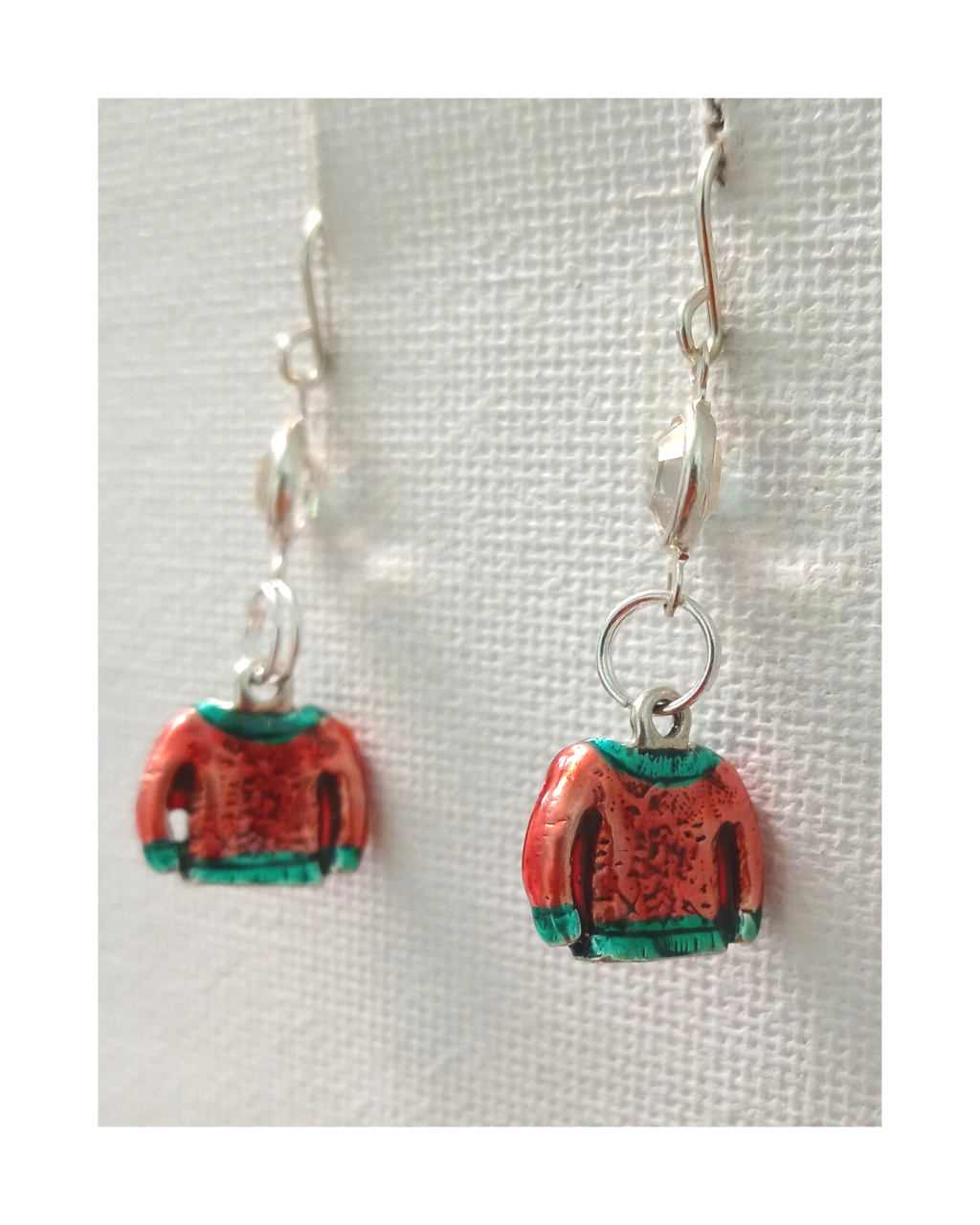 So much fun! Sterling 3-D hand-enameled 2-sided sweater with seed beads and Swarovski crystal earrings. 1 5/8"L X 9/16"W ONE ONLY