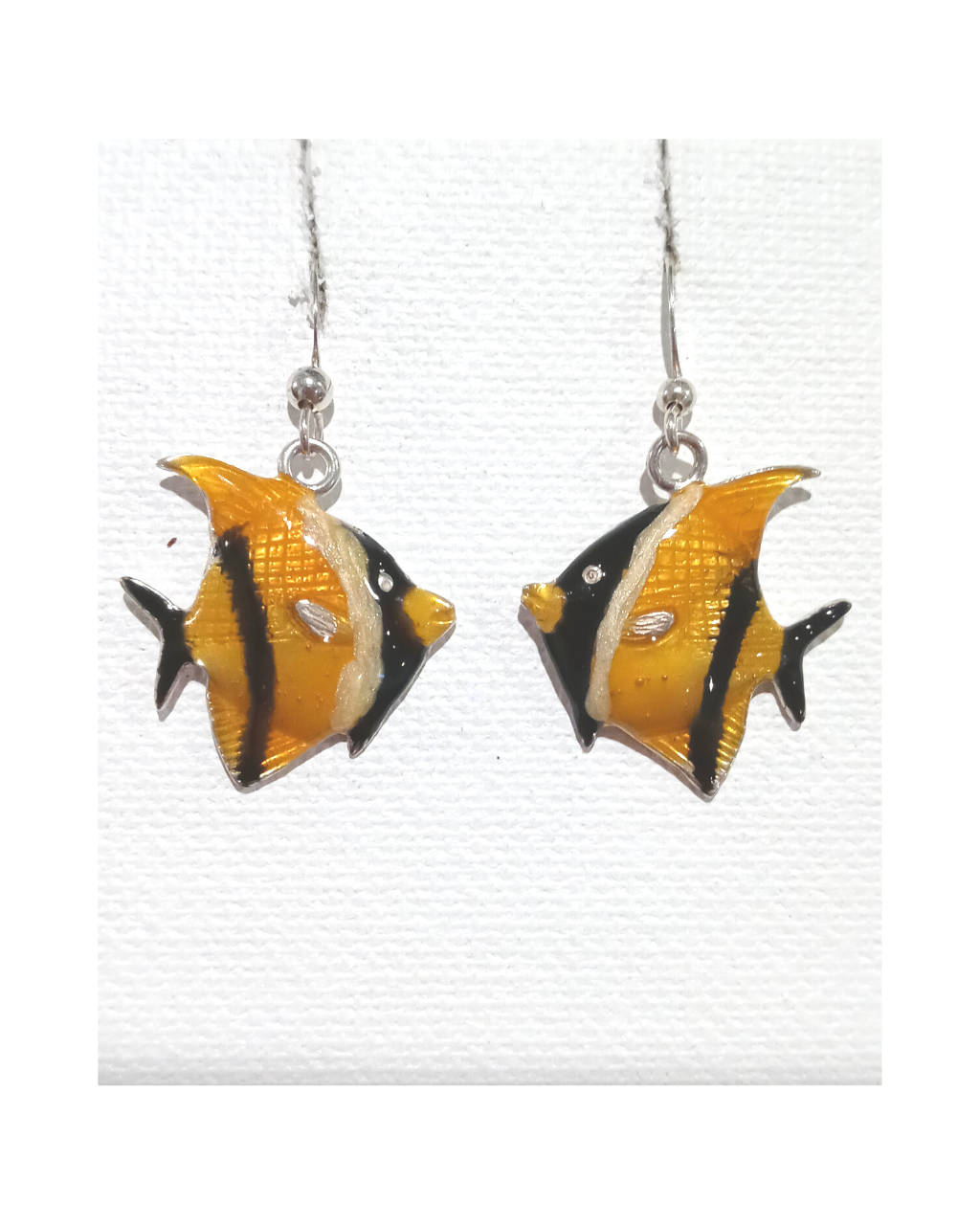 Wearable art exclusive sterling hand-enameled black and gold Moorish Idol tropical fish earrings. Love tropical fish, this will delight you. 1 1/2"H X 1 3/16"W