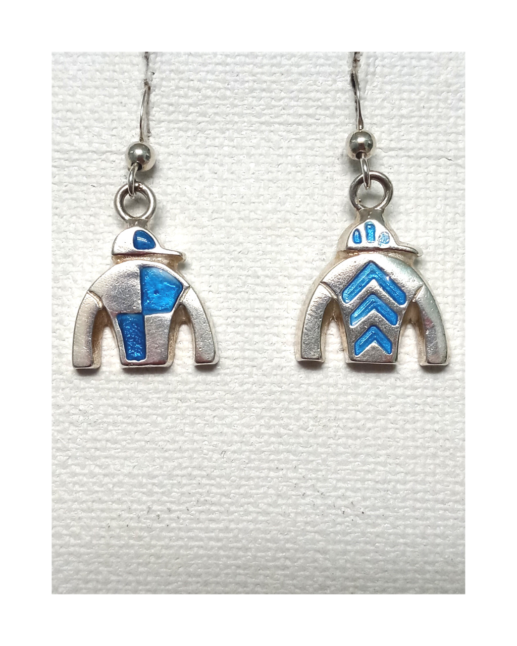 Exclusive jockey silk design for horse racing enthusiasts! Sterling Hand-enameled earrings you will love. 1 1/4"H X 5/8"W