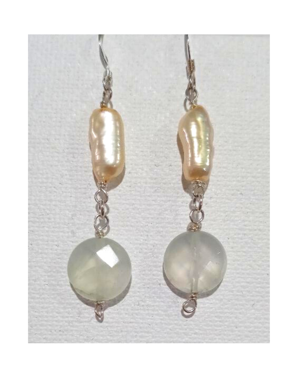 Sterling Golden/Peach Biwa Pearl and Light Green Prehnite Dangle Earrings with earwires Approx. 2 1/4". Gorgeous lustrous Biwa pearls and the light green Prehnite. A shimmery gorgeous pair of earrings.