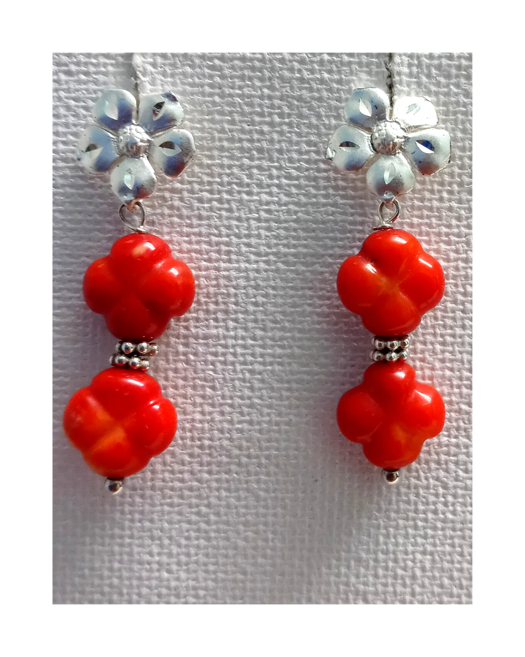 Exclusive Gorgeous Sterling Dogwood Flower Diamond-cut Post Earrings with Carved Red Coral Flowers 1 9/16"L X 7/16"W