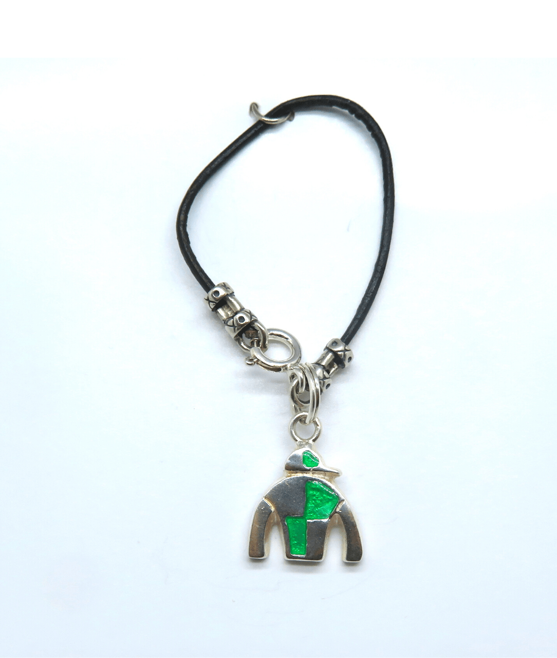 Jockey Silk Green Hand-enameled Removable Charm on Leather and Sterling Silver KooLoop approximately 2 1/2″, Removable Charm is 3/4″ L