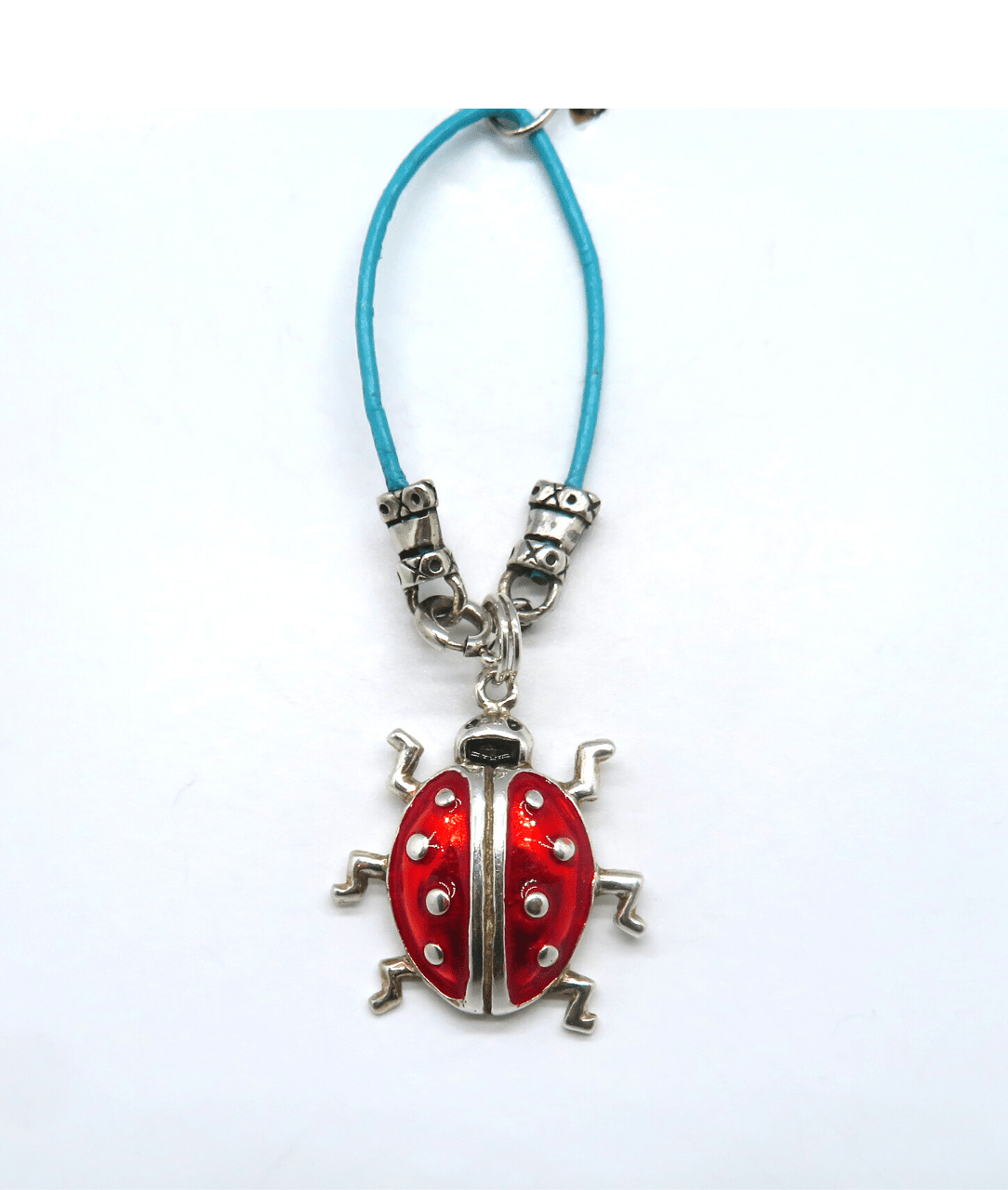 Sterling silver hand enamel ladybug charm on turquoise color leather KooLoop approximately 3" with sterling components. KooLoops are perfect to put on a purse, a zipper pull, a bookbag. The removable charm can be added to a chain or a charm bracelet. The leather loop opens like a necklace with the spring ring clasp.