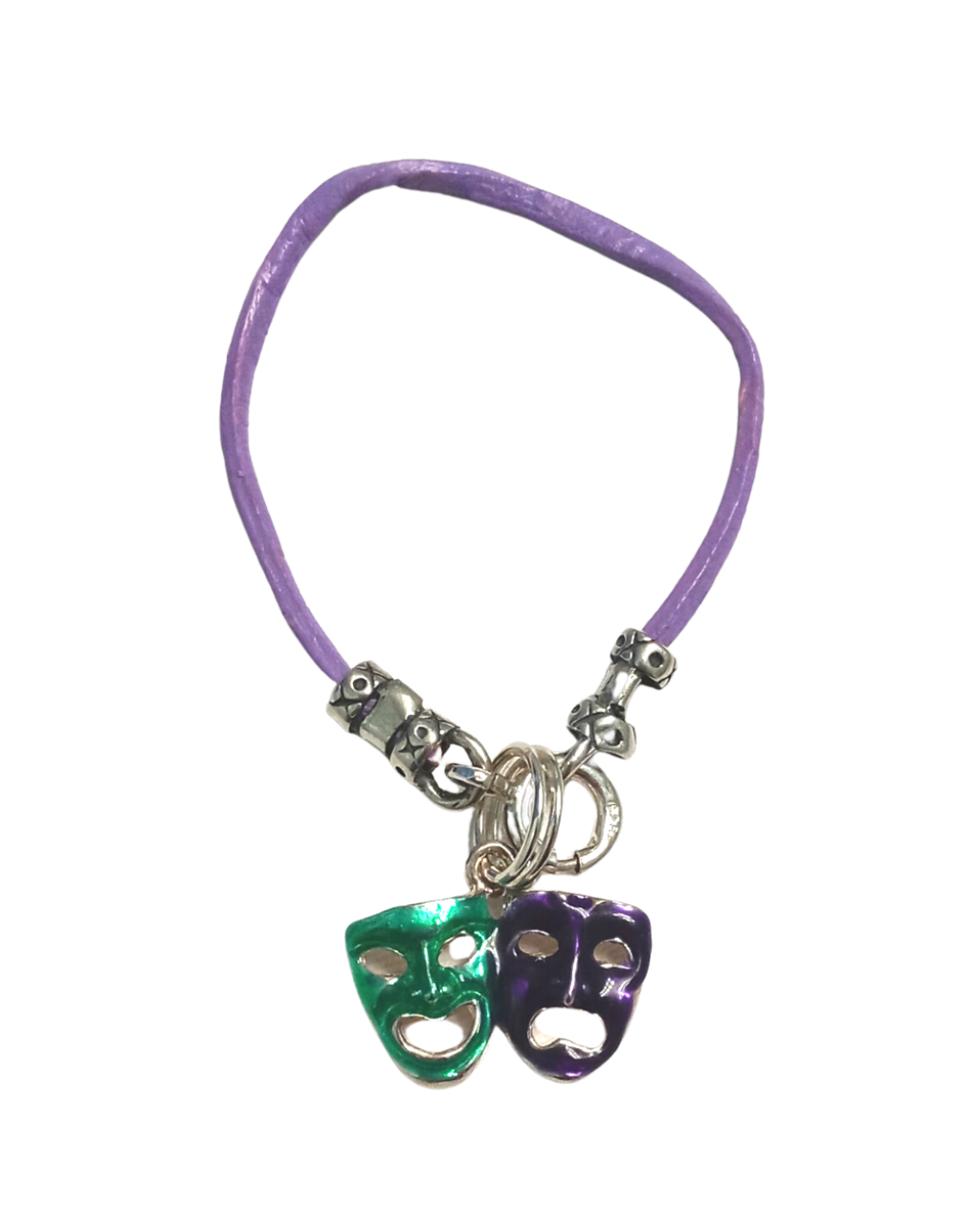Mardi Gras Hand-enameled Green Purple Comedy/Tragedy Removable Mask Sterling Charm 3/4"H X 11/16"W on 1 7/8" Leather KooLoop.
