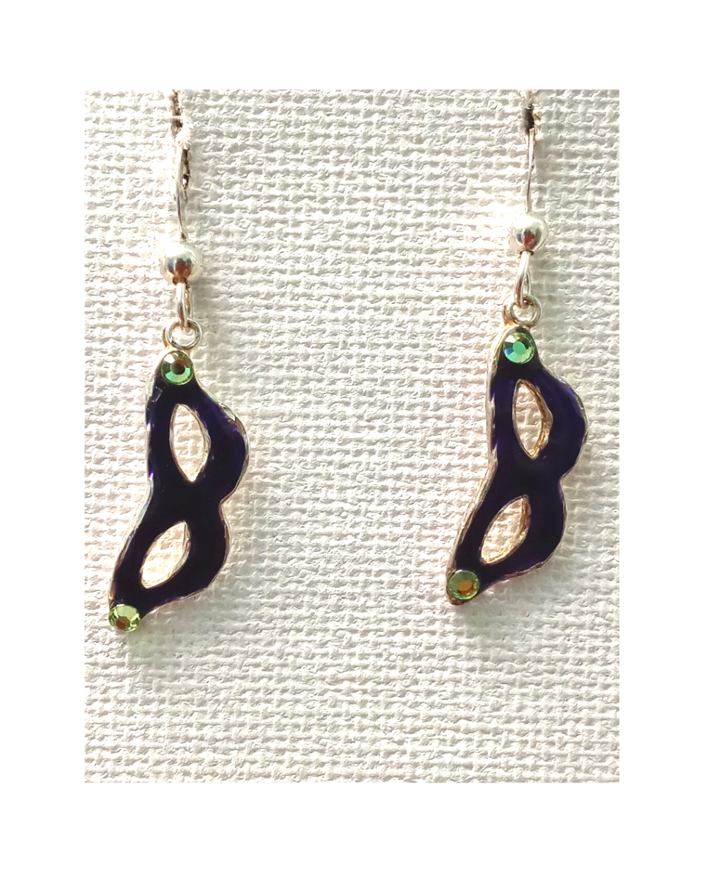 We are celebrating Mardi Gras with hand-enameled purple cat eye mask with crystal sterling earrings. 1 7/8"L X 5/16"W ONE ONLY