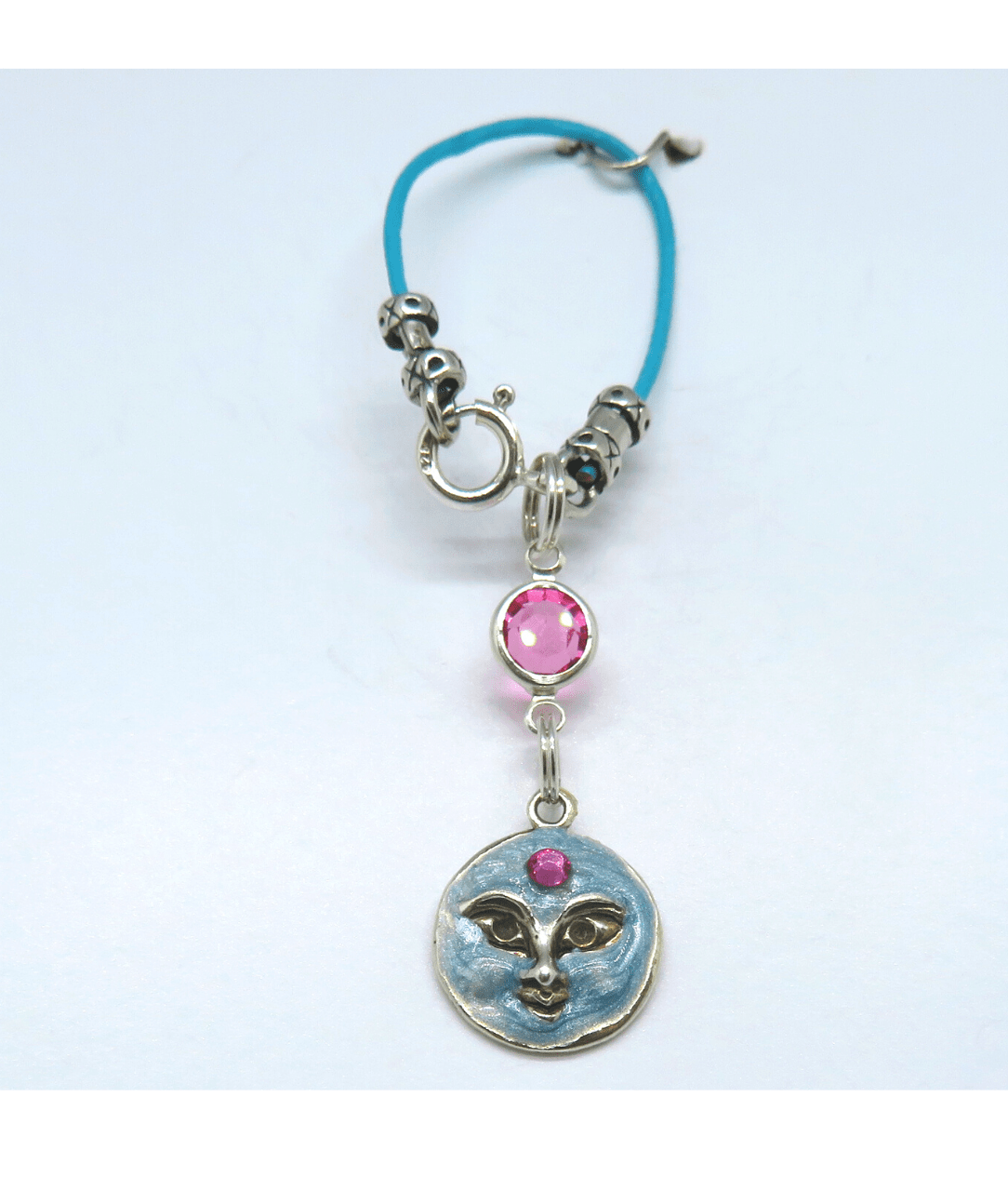 Moonface Hand-enameled with Swarovski Crystal Removable Sterling Silver Charm on Leather and Sterling Silver KooLoop Approximately 2 3/8", Removable Charm is 1 1/4"
