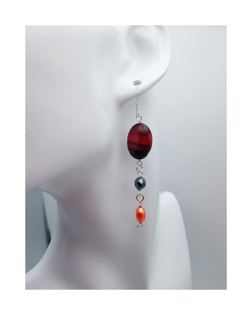 Sterling Oval Dyed Red Tiger's Eye, Faceted Hematite and Copper-colored Pearl Dangle Earrings with earwires Approx. 2 3/4". Gorgeous mahogany-color Tiger's Eye, shimmering metallic Hematite, and stunning copper/orange pearls. You will absolutely love these distinctive design earrings. These colors are perfect together.