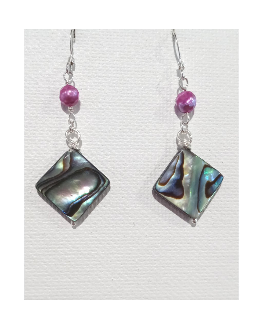 Gorgeous Abalone shell beads with dark pink faceted pearl sterling earrings 2" ONE ONLY