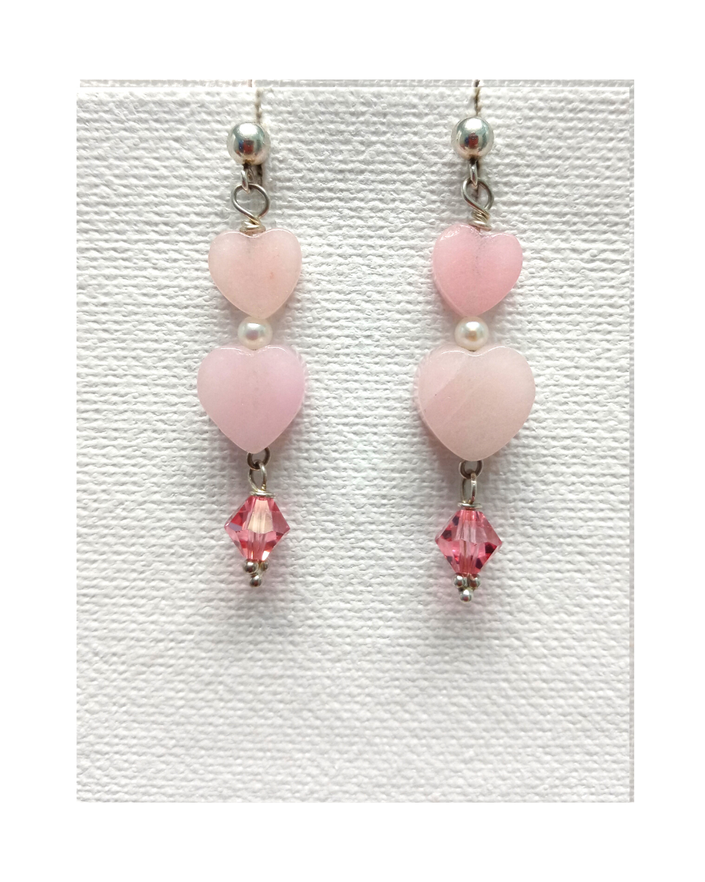 Pink Jade Hearts, Pearl and Crystal Sterling Post Earrings 1 3/4" L X 7/16"W ONE ONLY