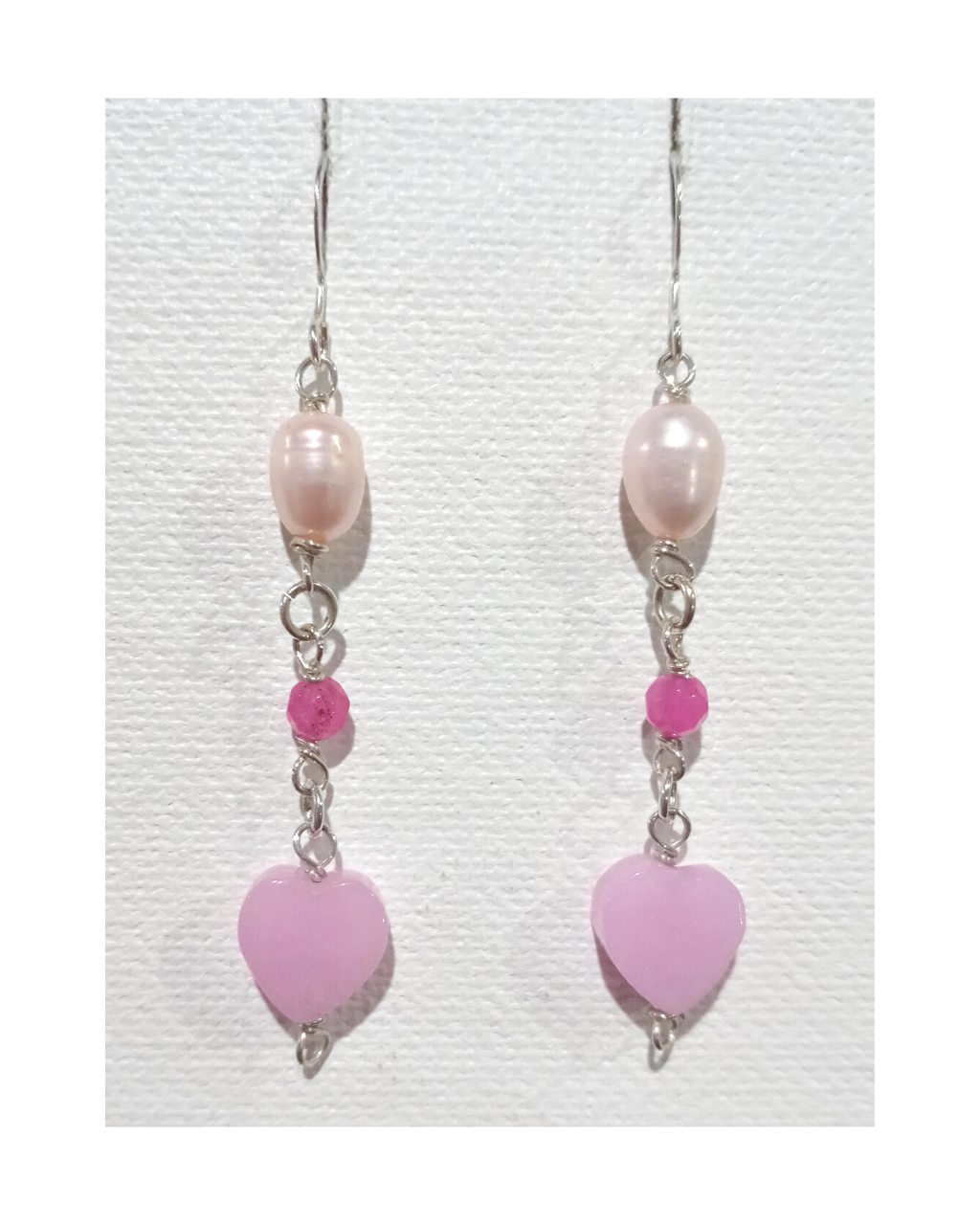 Sterling Pink Pearl, Faceted Dyed Fuschia Jade, and Hear-shaped Pink Jade Dangle Earrings with earwires Approx. 2 7/16". Shades of pink with a beautiful pink jade heart. For you, your daughter, or your grandaughter.