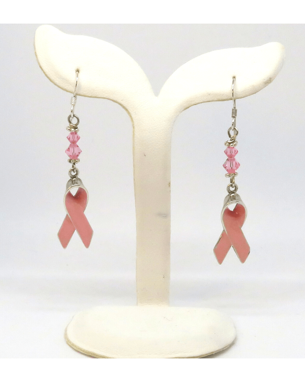 Pink Ribbons Hand-enameled with Pink Crystal Sterling Silver Earrings