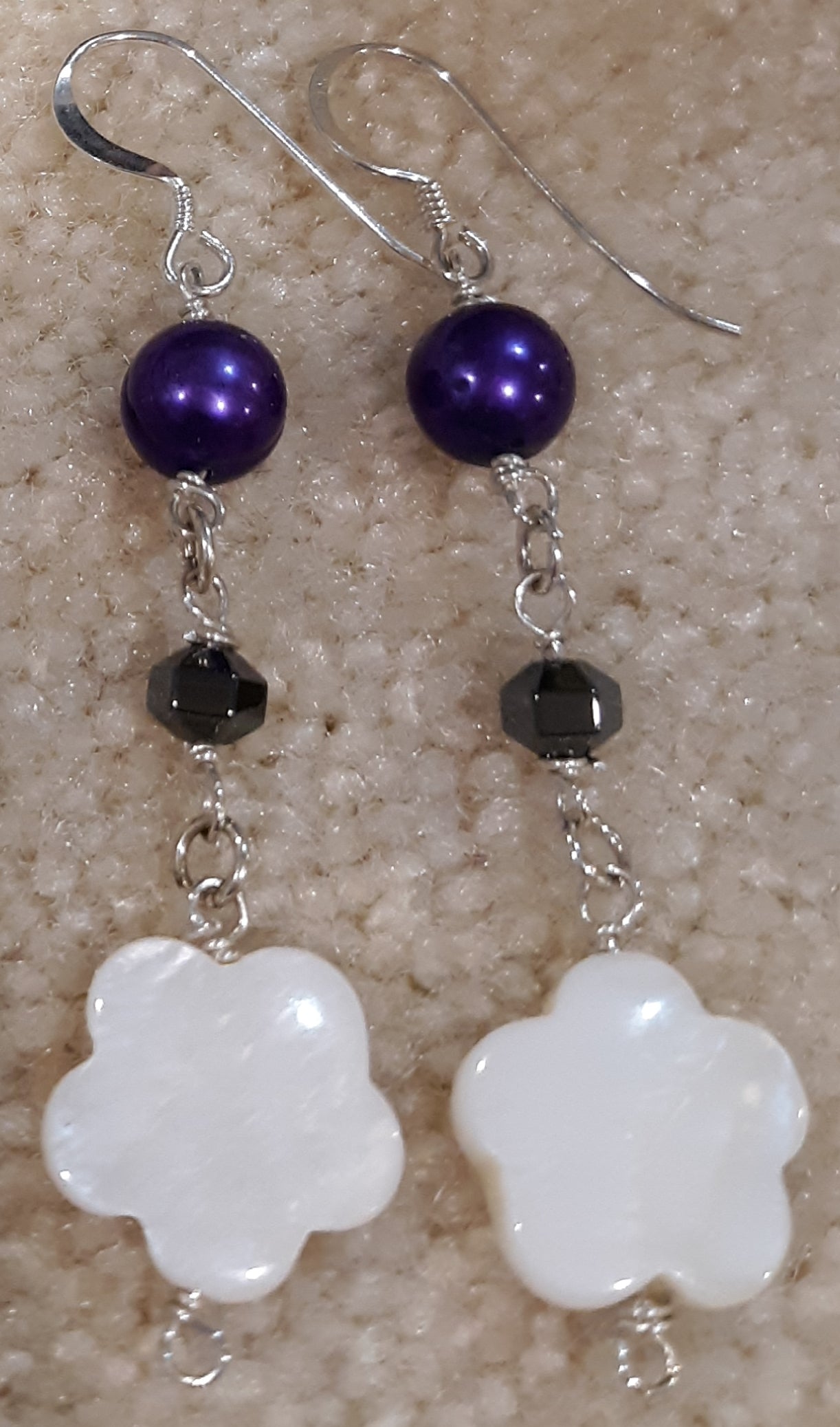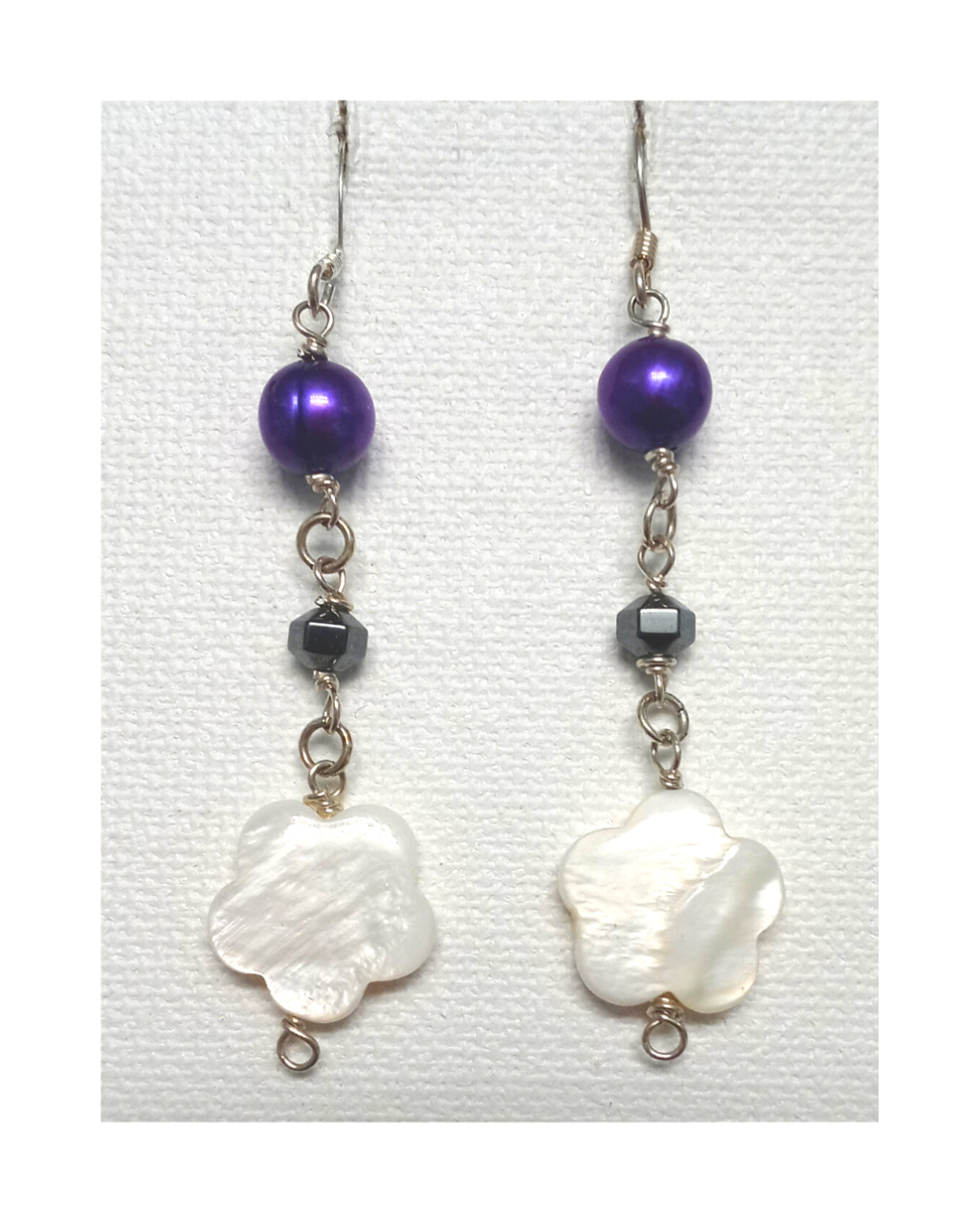 Sterling silver genuine dyed purple pearl, faceted hematite, and mother-of-pearl flower-shaped dangle earrings with earwires. Purples, pinks, greys, blacks. These beautiful earring go with everything!
