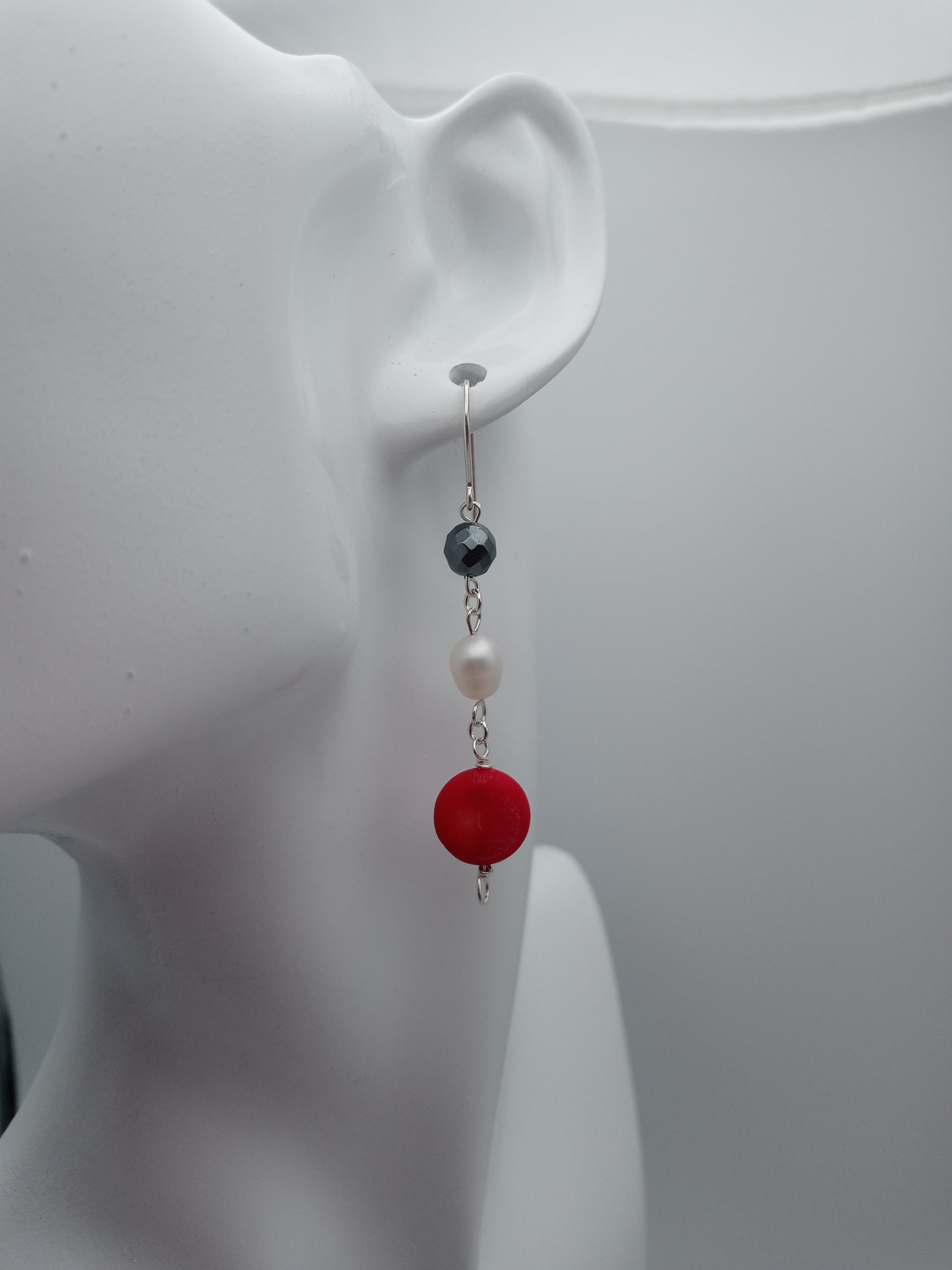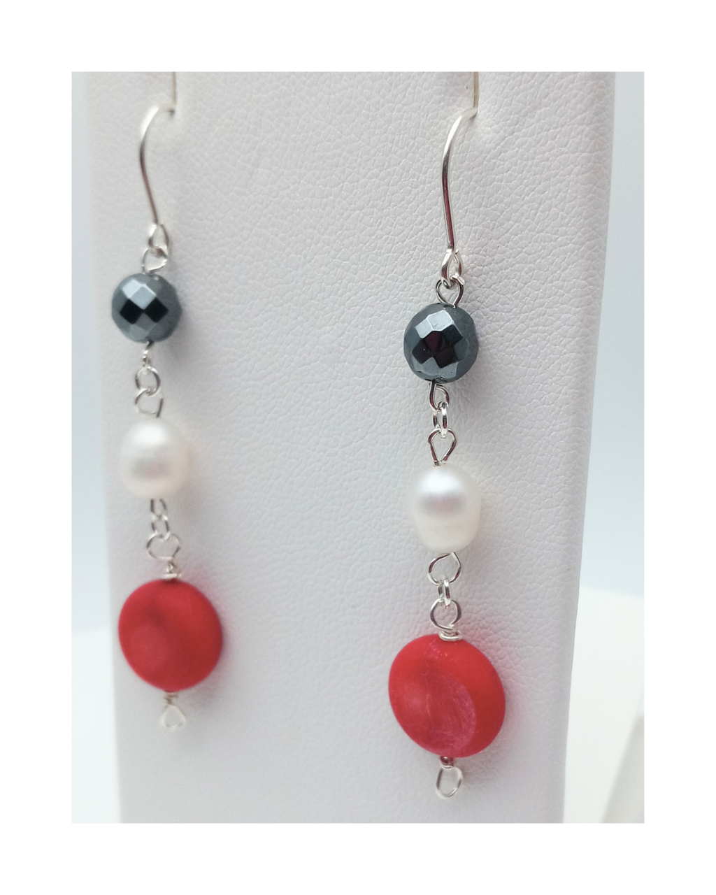 Sterling 925 Faceted Hematite, White Pearl, and Red Coin-Shaped Coral Earrings. ONE ONLY
