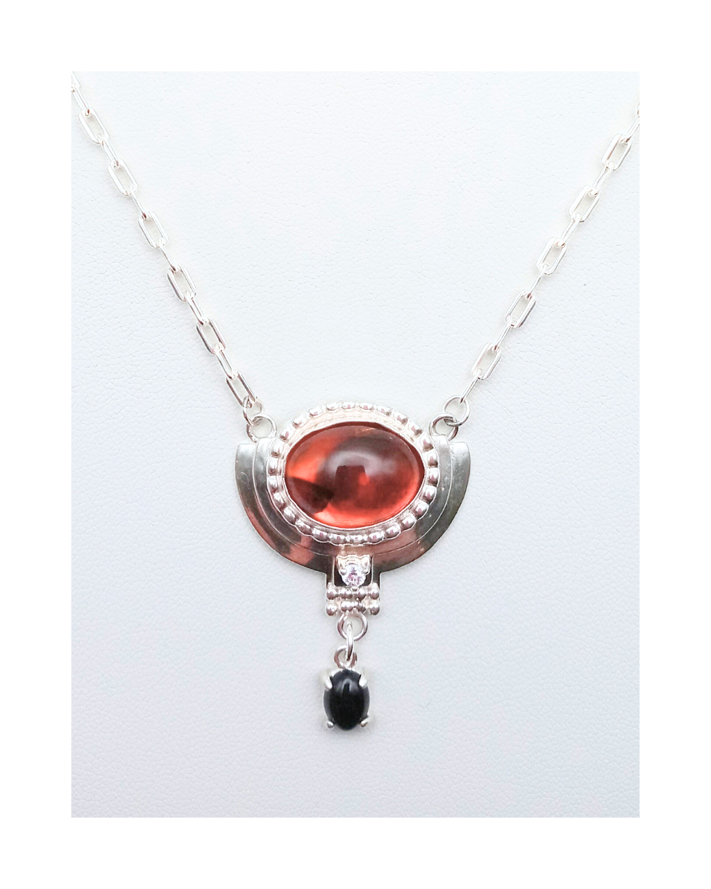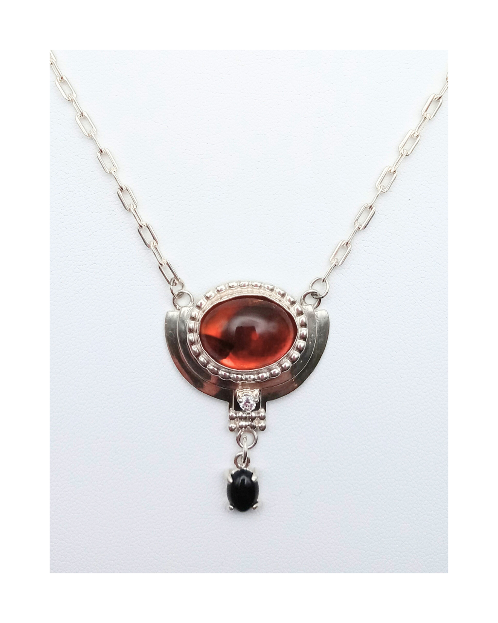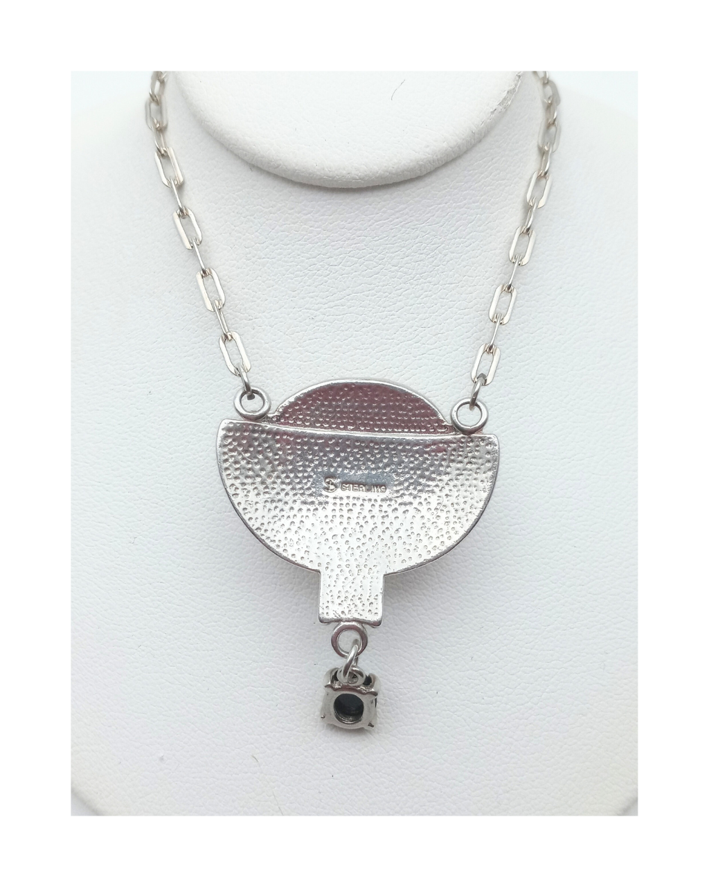 This amazing sterling silver 925 design from our Vault Collection is a Amber, Black Onyx, and cubic zirconia necklace and earring set that will take your breath away! If you are a jewelry lover and love vintage styles, this will thrill you. The 16" necklace has a spectacular attached pendant with a stunning breadth of a 1 1'4" X 1 3/4" drop. The gorgeous post earrings are 1 5/8" X 3/4" with full coverage on your earlobe. Love unique? Grab it now. ONLY ONE of this incredible design in our jewelry Vault!