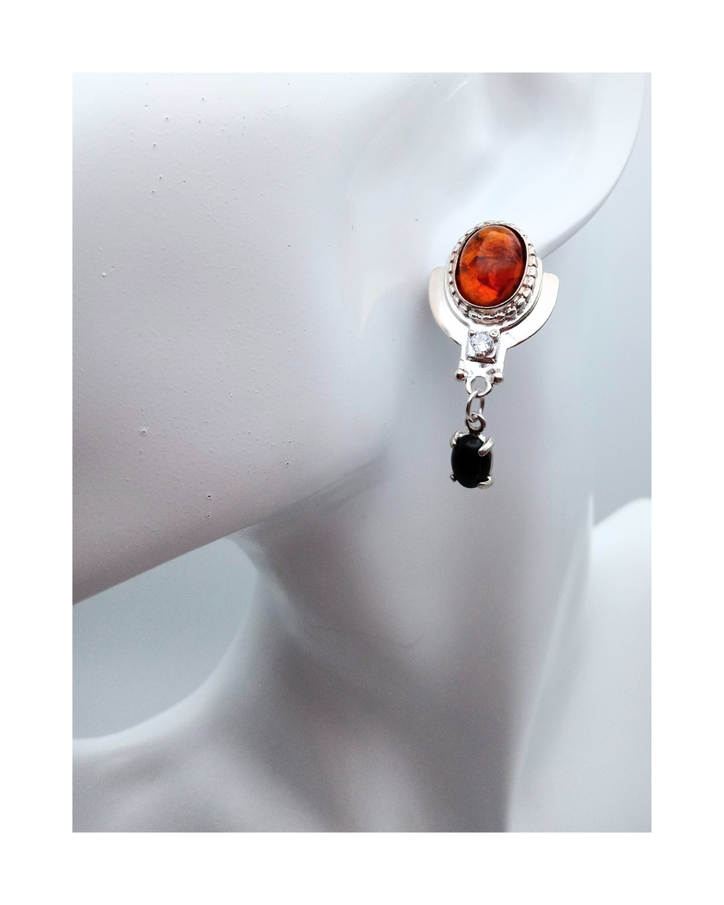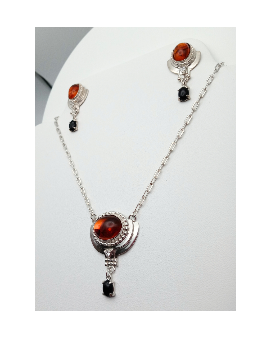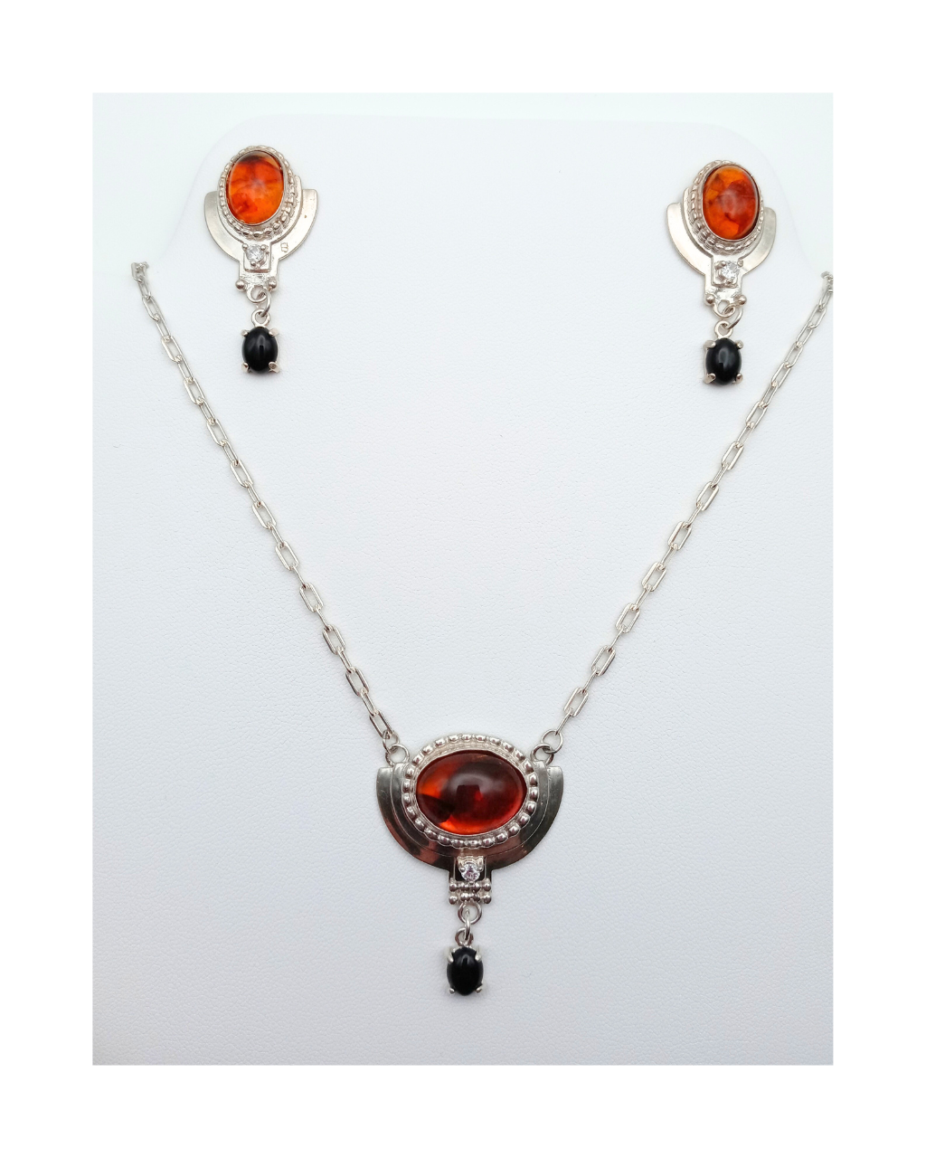 Sterling 925 Honey Amber, Black Onyx, and Sparkling Cubic Zirconia Necklace and Earring Set. ONE ONLY.