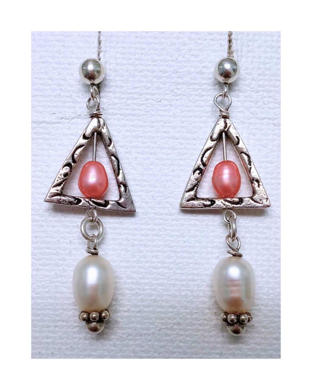 These sterling silver and pearl earrings are so much fun. You will enjoying playing with them! The pink pearls can move up and down the silver wire inside the swivel triangles. The triangles move around the gorgeous bright pink pearls and then you have a luscious white pearl dangling below the moving pearl and triangle. The perfect combination for a true pearl jewelry lover! ONE ONLY Grab it before it's gone!