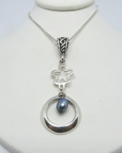 An exquisite jewelry design, this sterling silver pendant features a beautiful cut-out flower and a dark grey dangling pearl for a touch of color. The removable pendant measures 1 3/4"H by 3/4"W, and comes with an 18" box chain. ONLY ONE.