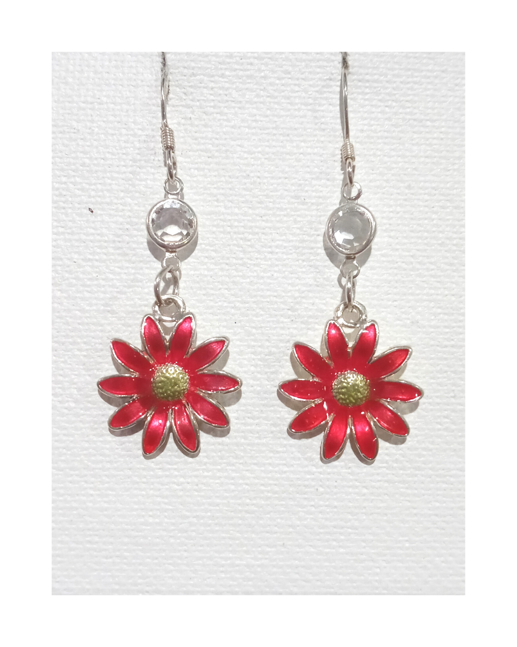 Beautiful bright pink sterling exclusive hand-enameled flower with clear Swarovski crystal earrings 2 1/8"L X 3/4"W. Limited editions. Make someone special's day with beautiful dangle earrings.