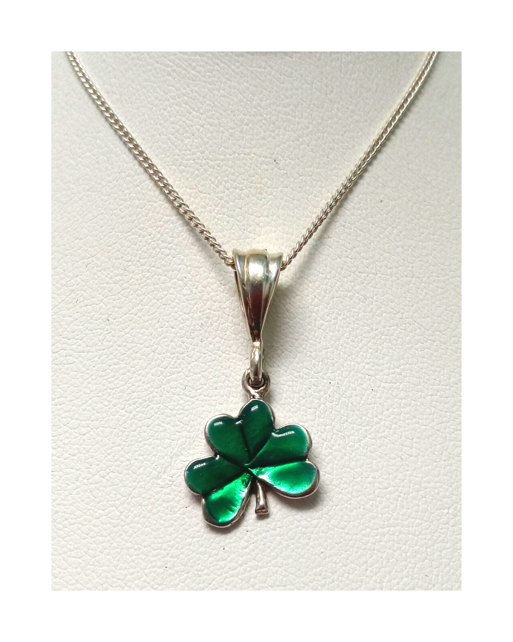 Enjoy wearing this hand-enameled green sterling shamrock removable pendant 1 1/4"L X 5/8"W on 16" Curb Chain. A three-leaf clover to celebrate Spring. Have fun wearing it on leather and other chains to create new designs!