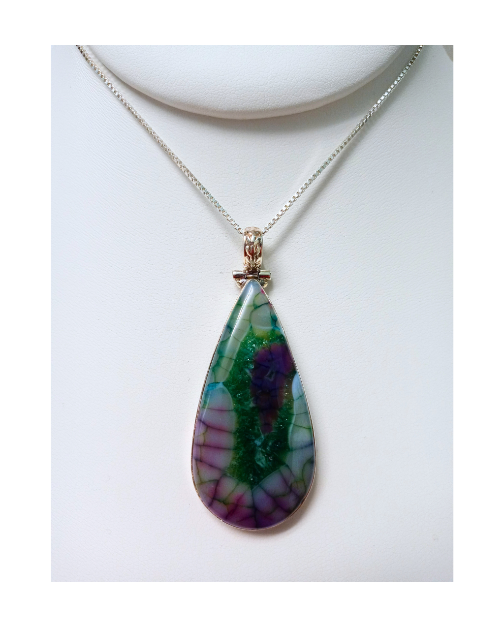 This beautiful multi-color purple, green, and yellow teardrop-shaped Agate removable pendant is from our Vault Collection. It comes with an 18" box chain. You will love seeing the natural colors of this gorgeous agate gem when you hold your pendant up to the light.. Like looking through a kaleidoscope! Gem lovers will cherish this unique agate. Grab it before it's gone. ONE ONLY!