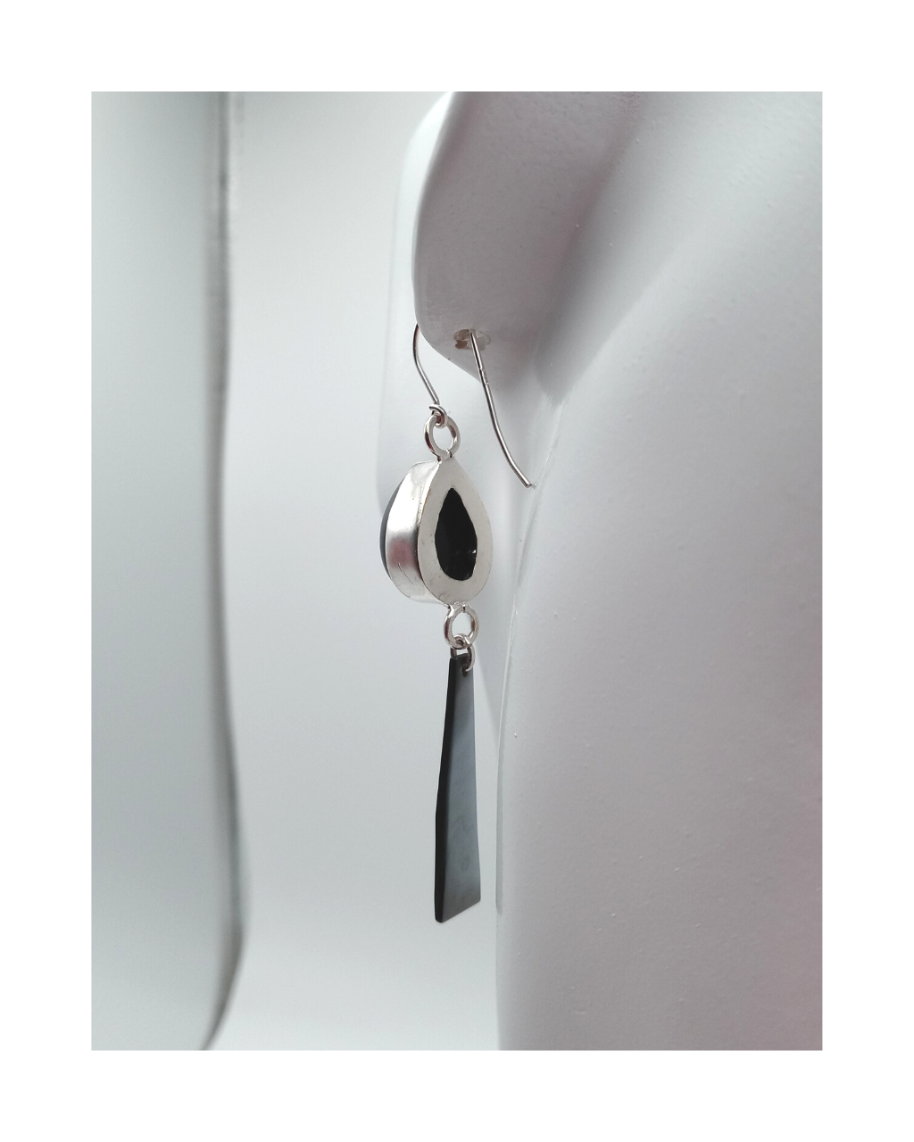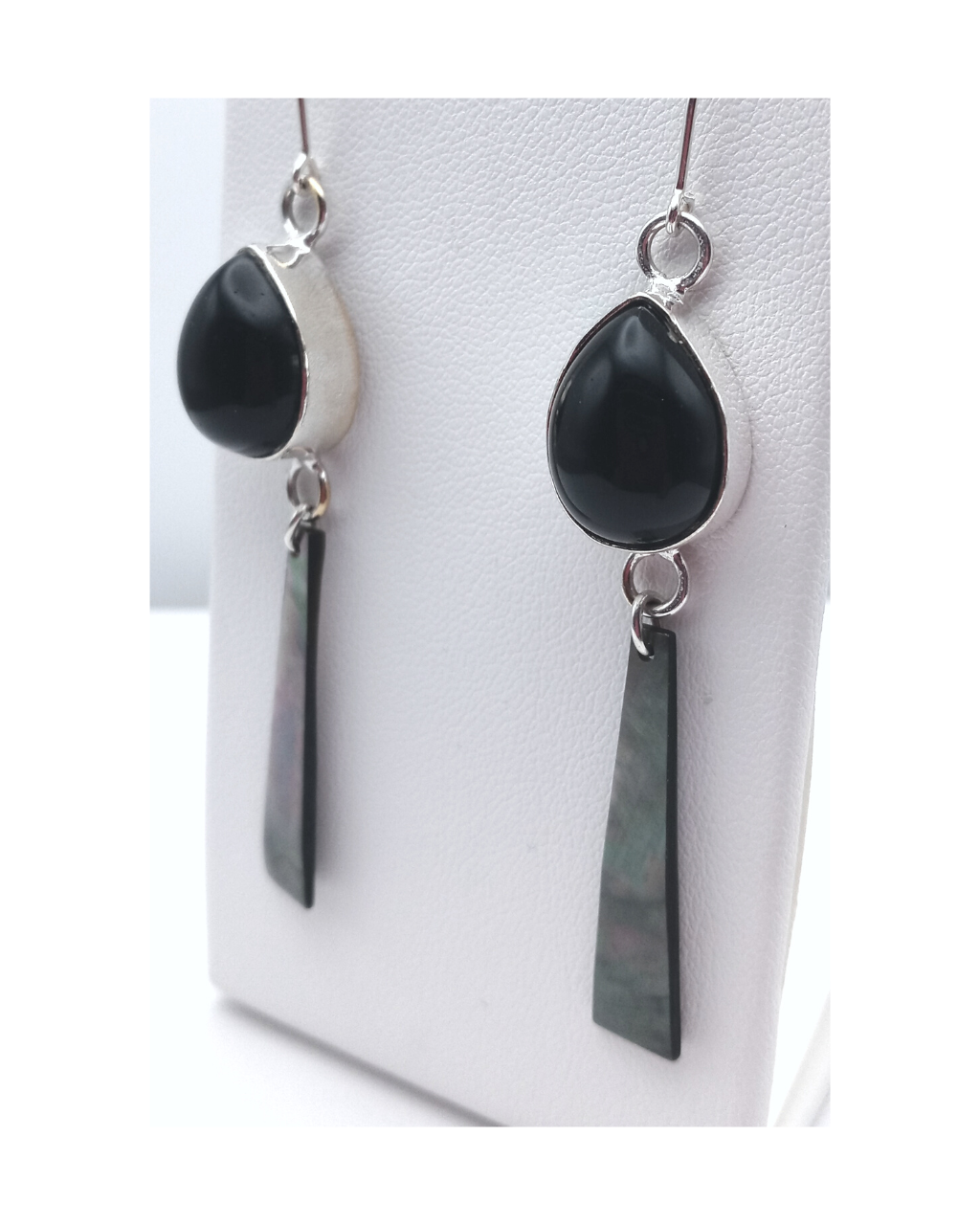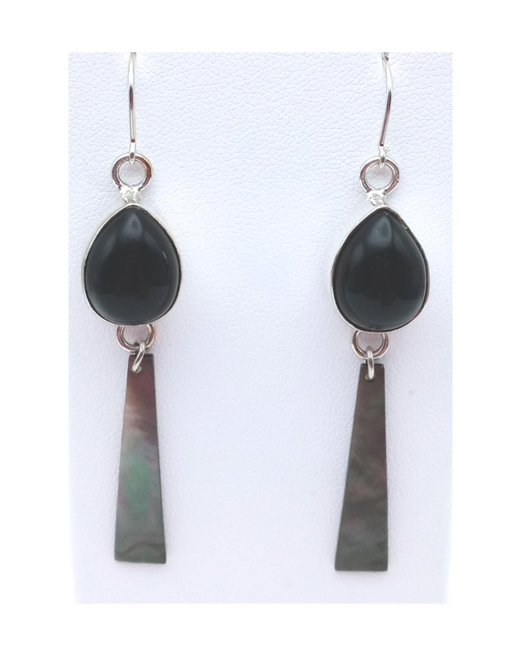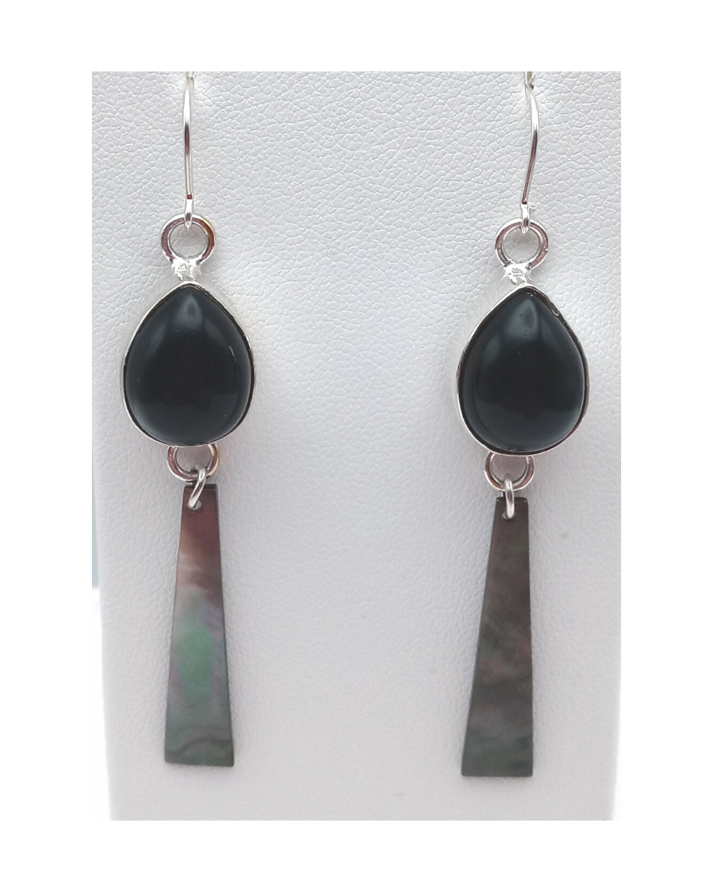 Sterling Teardrop Black Onyx and Beautiful Black Mother-of-Pearl Shell Earrings 2 11/16"L X 1/2"W. ONE ONLY