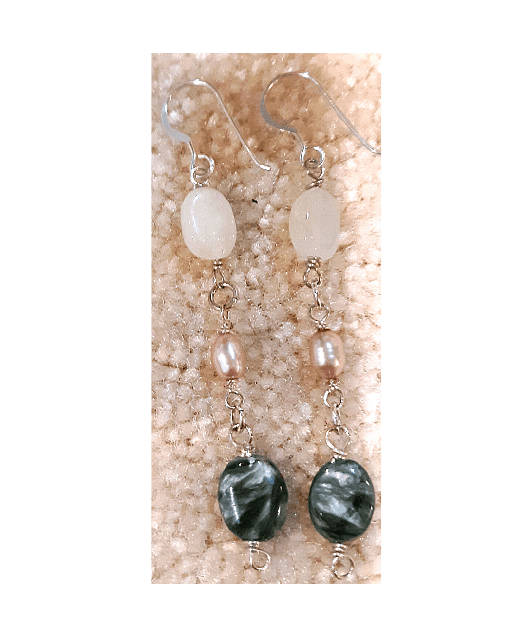 Sterling White Quartz, Pink Pearl and Russian Seraphinite Dangle Earrings with earwires Approx. 2 1/2". A stunning design featuring Russian Seraphinite that has a beautiful green and white whispy, shimmering glowing natural markings. It is used by some to aid in contacting angels and nature spirits and connects with the heart chakra.
